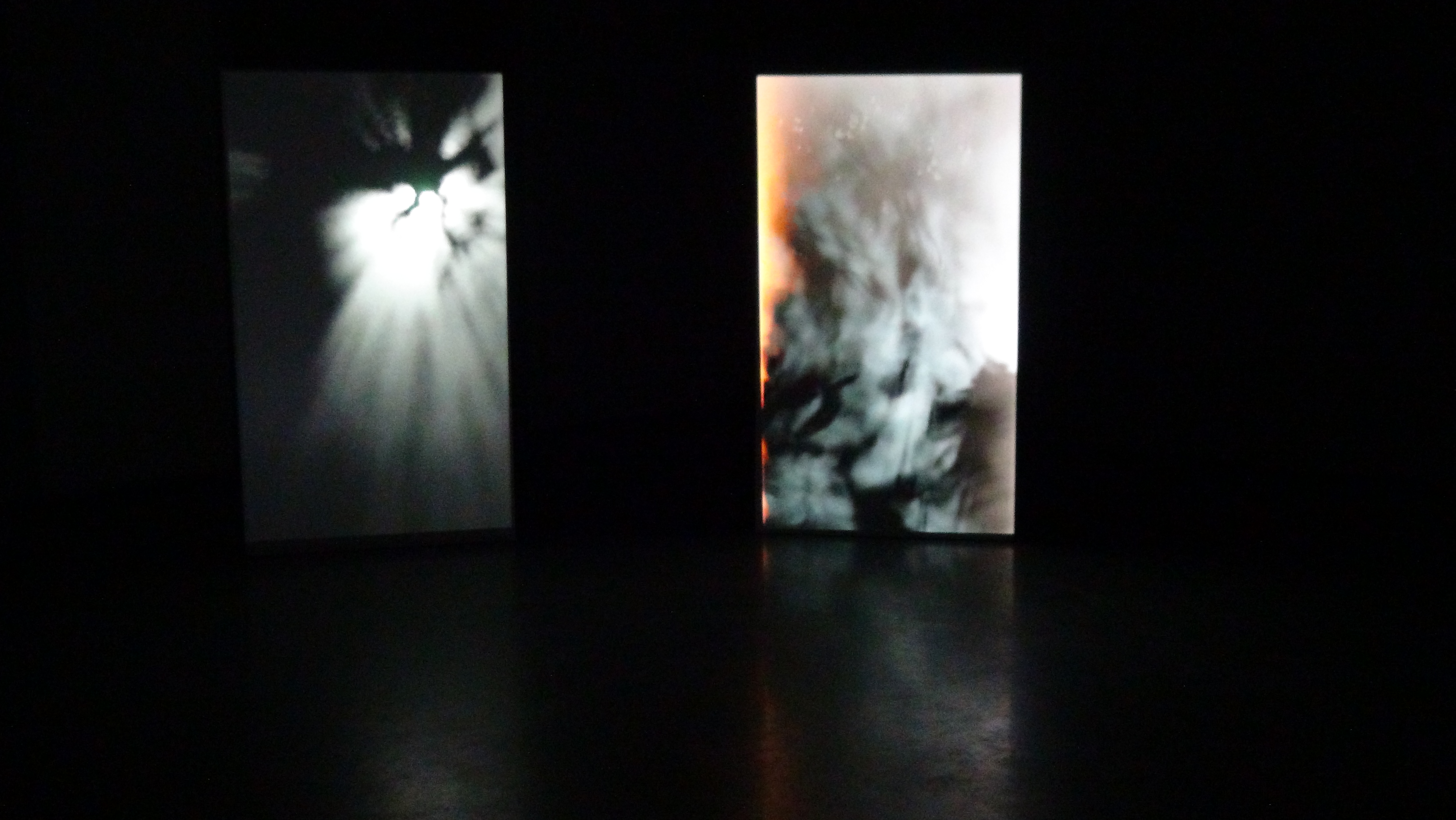 The videos are animated using the software Blender and then projected onto wooden panels measuring 1x2 meters in size.